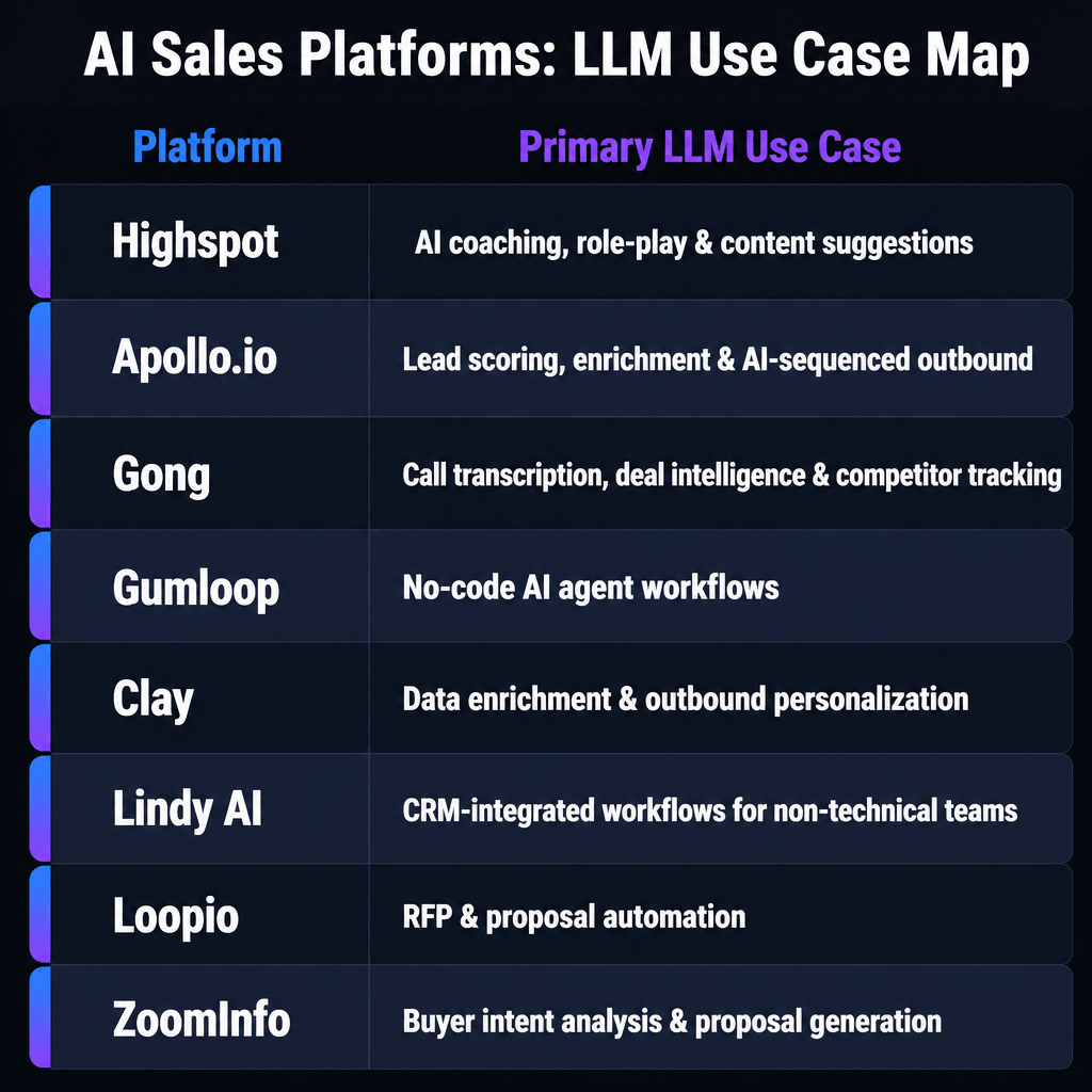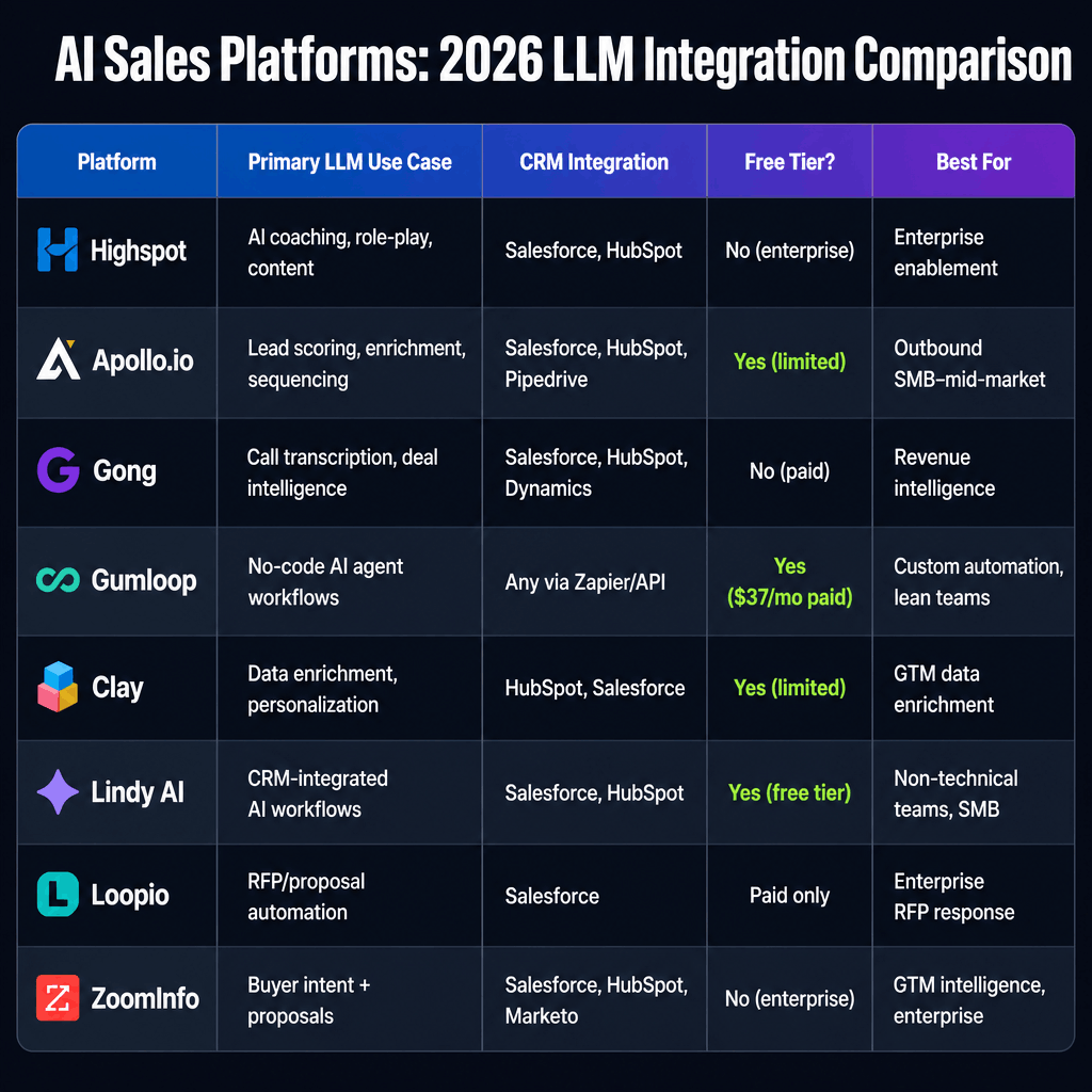 PlatformPrimary LLM Use CaseCRM IntegrationFree Tier?Best ForHighspotAI coaching, role-play, content suggestionsSalesforce, HubSpotNo (enterprise)Enterprise sales enablementApollo.ioLead scoring, enrichment, sequencingSalesforce, HubSpot, PipedriveYes (limited)Outbound prospecting, SMB to mid-marketGongCall transcription, deal intelligenceSalesforce, HubSpot, DynamicsNo (paid)Revenue intelligence, call coachingGumloopNo-code AI agent workflowsAny via Zapier/APIYes ($37/mo paid)Custom automation, lean teamsClayData enrichment, outbound personalizationHubSpot, SalesforceYes (limited)GTM data enrichmentLindy AICRM-integrated AI employee workflowsSalesforce, HubSpotYes (free tier)Non-technical teams, SMBLoopioRFP/proposal automationSalesforcePaid onlyEnterprise RFP responseZoomInfoBuyer intent + proposal generationSalesforce, HubSpot, MarketoNo (enterprise)GTM intelligence, enterprise