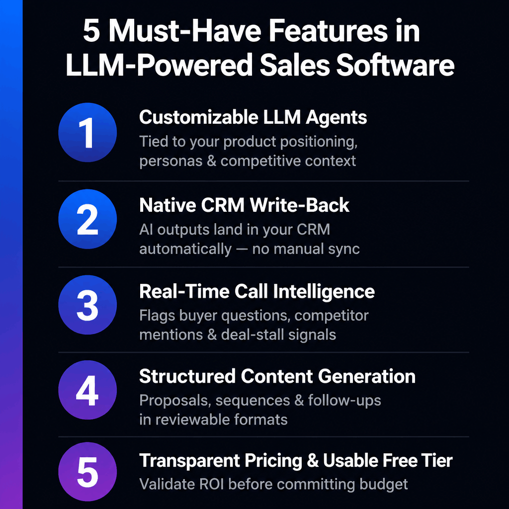 The five most important features are: (1) customizable LLM agents tied to your product and ICP, (2) native CRM write-back so AI outputs land in your system of record without manual sync, (3) real-time call intelligence that flags buyer questions and deal-stall signals, (4) structured content generation for proposals and sequences, and (5) a transparent free tier so you can validate ROI before committing budget. Platforms that check all five are rare; most excel at two or three.