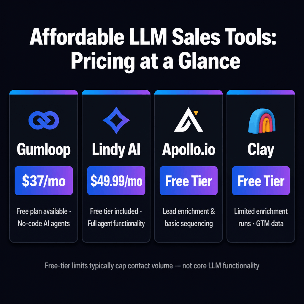Yes. Gumloop starts free with paid plans at $37/month. Lindy AI offers a free tier with full agent functionality and a $49.99/month plan for complete sales workflow automation. Apollo.io has an SMB-accessible pricing tier for lead enrichment and AI sequencing. Free-tier limitations typically cap contact volume rather than core LLM functionality, so you can validate whether the AI works for your use case before paying.