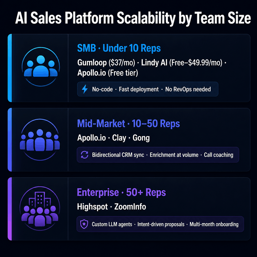 Default's ranking of the top 11 AI sales tools for B2B performance in 2026 provides a cross-vendor scalability benchmark across team sizes, confirming that enterprise tools outperform on depth while no-code tools outperform on time-to-value.