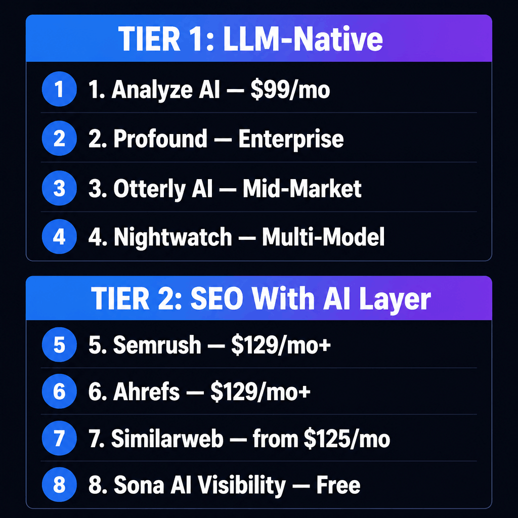 The top tools are Analyze AI (LLM-native, $99/mo), Profound (enterprise LLM dashboards with conversation-level citation logs), Nightwatch (multi-model monitoring across ChatGPT, Claude, and Google AI Overviews), Semrush AI Toolkit (SEO plus AI hybrid), Ahrefs (content and backlink gaps), and Sona AI Visibility (free AI crawlability audit). The right stack combines one LLM-native tool with one traditional SEO tool and a dedicated AI visibility auditor, because no single platform covers all three layers.