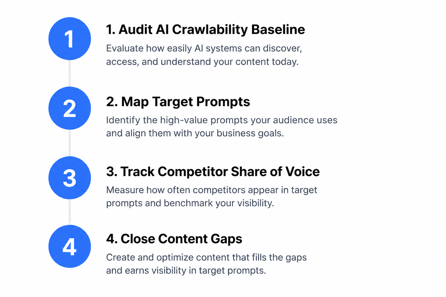 Step 1: Audit your AI crawlability baseline. Run a free technical audit with Sona AI Visibility to confirm AI engines can actually reach and read your site before you start tracking citations. Citation tracking data is meaningless if GPTBot is blocked by your robots.txt.