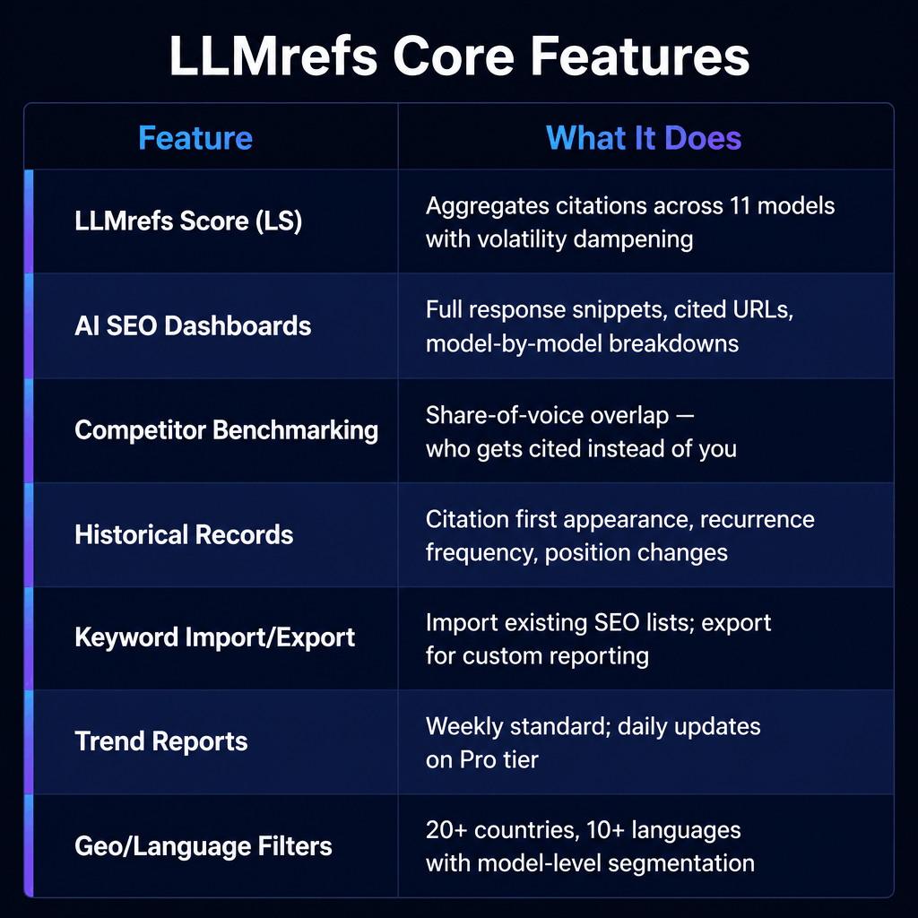 FeatureWhat It DoesLLMrefs Score (LS)Aggregates citation signals across all 11 models into a single metric with volatility dampeningAI SEO DashboardsFull response snippets, cited source URLs, model-by-model breakdownsCompetitor BenchmarkingShare-of-voice overlap, which competitors are cited alongside or instead of your brandHistorical RecordsCitation first appearance, recurrence frequency, position changes over timeKeyword Import/ExportImport existing SEO keyword lists for instant AI visibility views; export for custom reportingTrend ReportsWeekly reports standard; daily reports on Pro tierGeo/Language FiltersSegment by model, country, or language across 20+ countries and 10+ languages