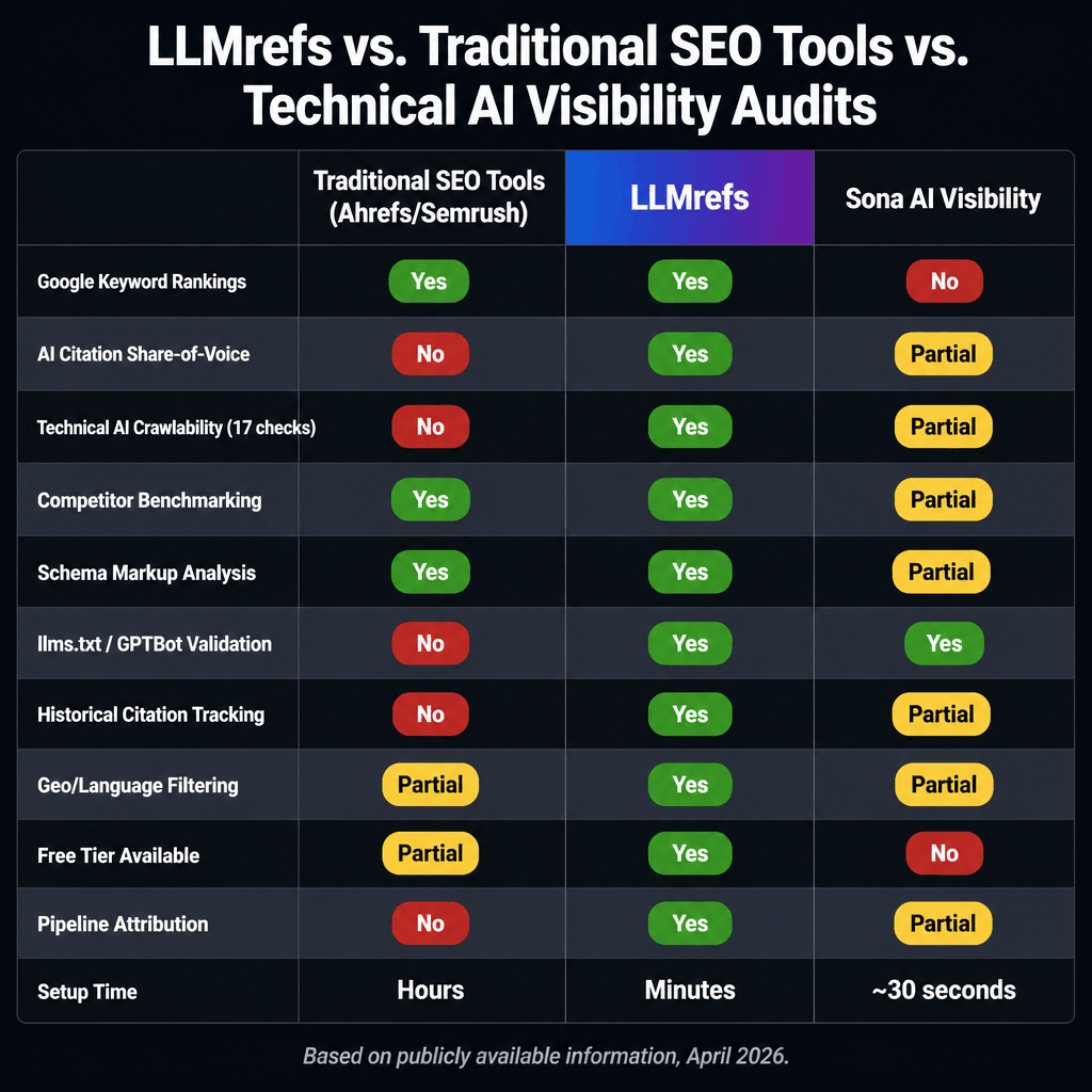 CapabilityTraditional SEO Tools (e.g., Ahrefs/Semrush)LLMrefsSona AI VisibilityTracks Google keyword rankingsYesNoNoTracks AI citation share-of-voiceNoYesNoAudits technical AI crawlabilityNoNoYes (17 checks)Competitor benchmarkingYesYesNoSchema markup analysisPartialNoYesllms.txt / GPTBot validationNoNoYesHistorical citation trackingNoYesNoGeo/language filteringYesYes (20+ countries)NoFree tier availableTrial onlyUnclearYes (5 audits/day)Pipeline attributionPartialNoYes, via Sona platformSetup timeHoursMinutes~30 seconds
