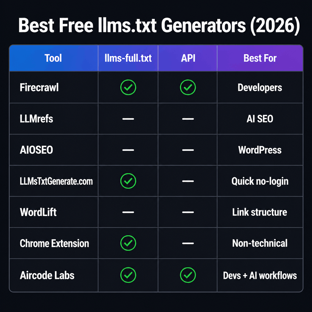 ToolTypeFree TierGenerates llms-full.txtAPI AvailableBest ForFirecrawl / llmstxt.firecrawl.devWeb + Open SourceYesYesYesDevelopers, custom workflowsLLMrefsWeb toolYesNoNoAI SEO, brand-aware outputAIOSEOWordPress pluginYes (basic)NoNoWordPress site ownersLLMsTxtGenerate.comWeb toolYesYesNoQuick no-login generationWordLiftWeb toolYesNoNoLink-structure extractionChrome ExtensionBrowser extensionYesYes (ZIP)NoNon-technical usersAircode Labs (GitHub)Open source + MCPYesYesYes (MCP server)Devs + AI-assisted workflows