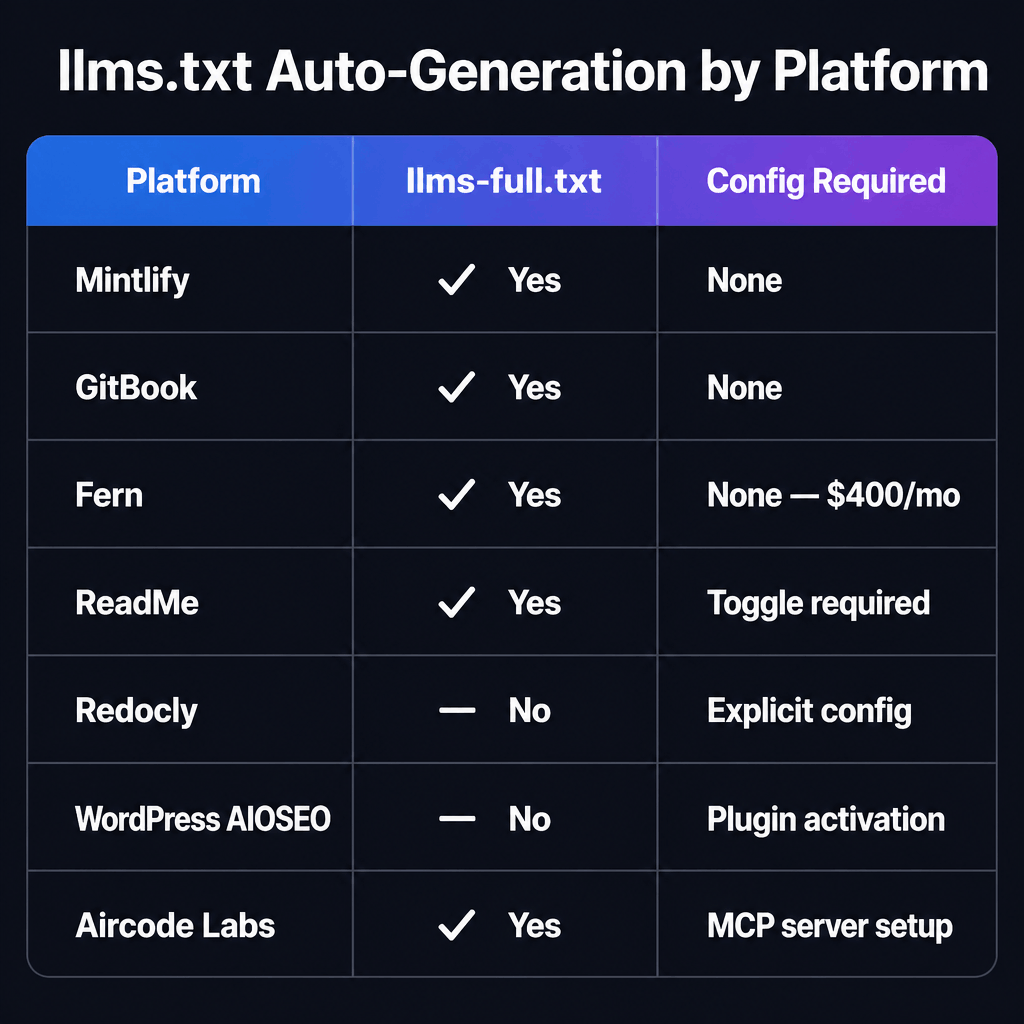 PlatformAuto-generates llms.txtGenerates llms-full.txtConfig requiredCostMintlifyYesYesNoneFree tier availableGitBookYesYesNoneFreeFernYesYesNone (auto-enabled)$400/monthReadMeYesYesToggle activationPaid plansRedoclyYesNoExplicit config requiredPaid plansWordPress (AIOSEO)YesNoPlugin activationFree (basic)GitHub docs (Aircode Labs)YesYesMCP server setupFree (open source)