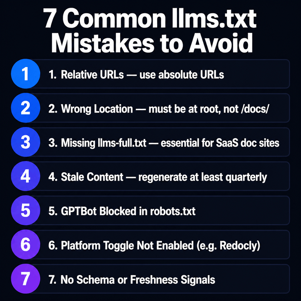 The most common llms.txt mistakes are using relative URLs instead of absolute ones, placing the file in a subdirectory instead of the root, omitting the `llms-full.txt` variant for content-heavy sites, and failing to update the file when site content changes.