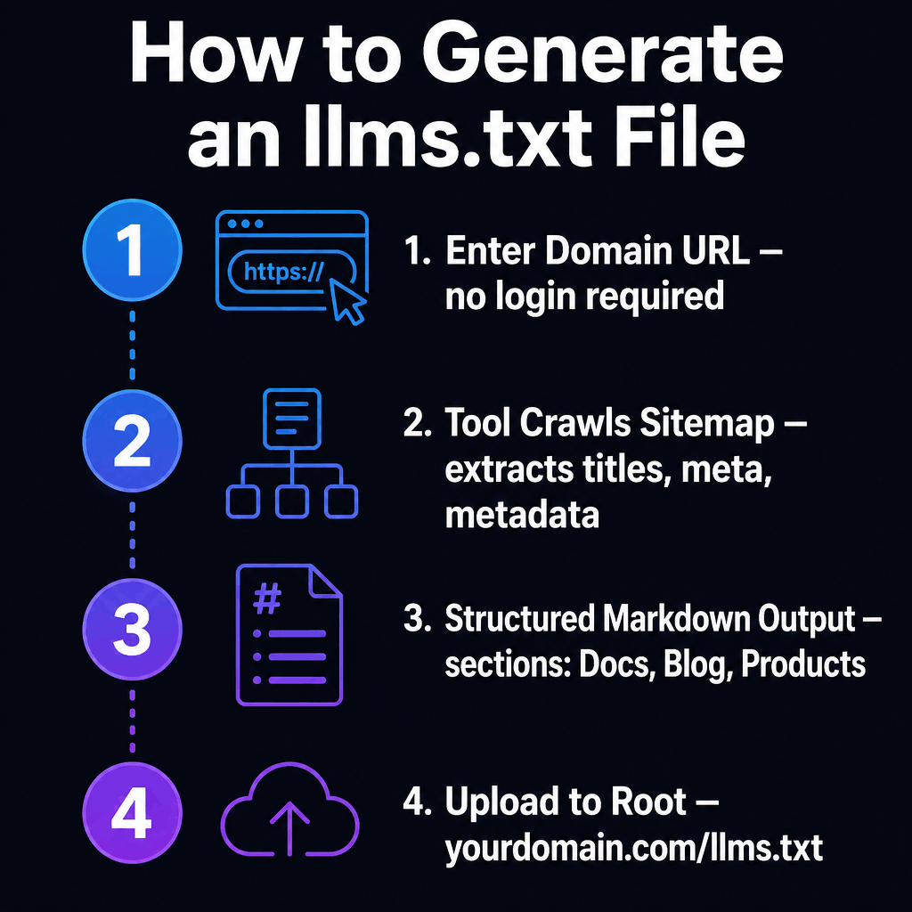 As LLMsTxtGenerate.com describes its process: "Enter your website URL; the tool pulls titles and descriptions to build a structured llms.txt in seconds."