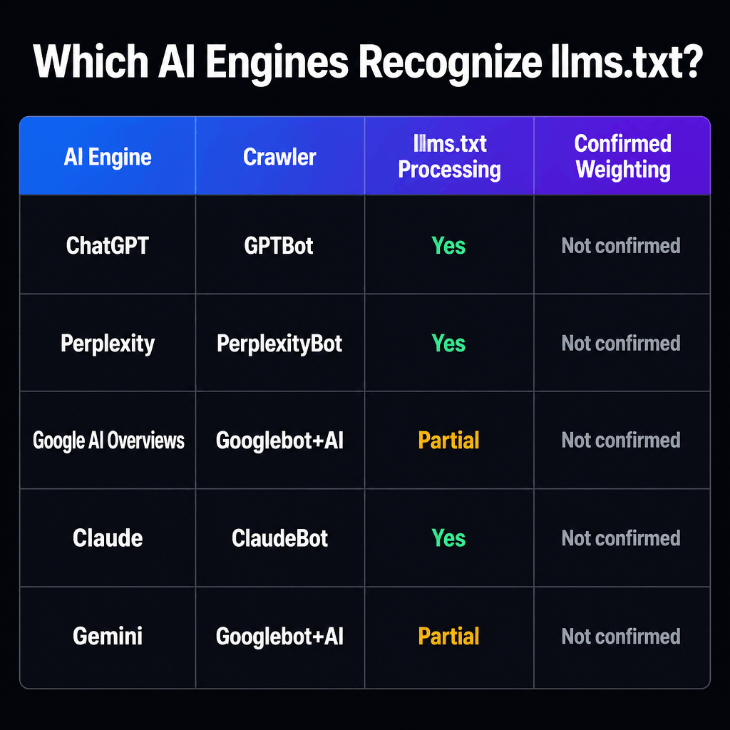 AI EngineCrawlerllms.txt ProcessingConfirmed WeightingChatGPT (OpenAI)GPTBotYes. Reads Markdown nativelyNot confirmedPerplexityPerplexityBotYes. Actively crawls for citationsNot confirmedGoogle AI OverviewsGooglebot + AI crawlerPartial. Googlebot ignores llms.txt; AI layer may use itNot confirmedClaude (Anthropic)ClaudeBotYes. Reads Markdown nativelyNot confirmedGemini (Google)Googlebot + AI crawlerPartial. Same as Google AI OverviewsNot confirmed