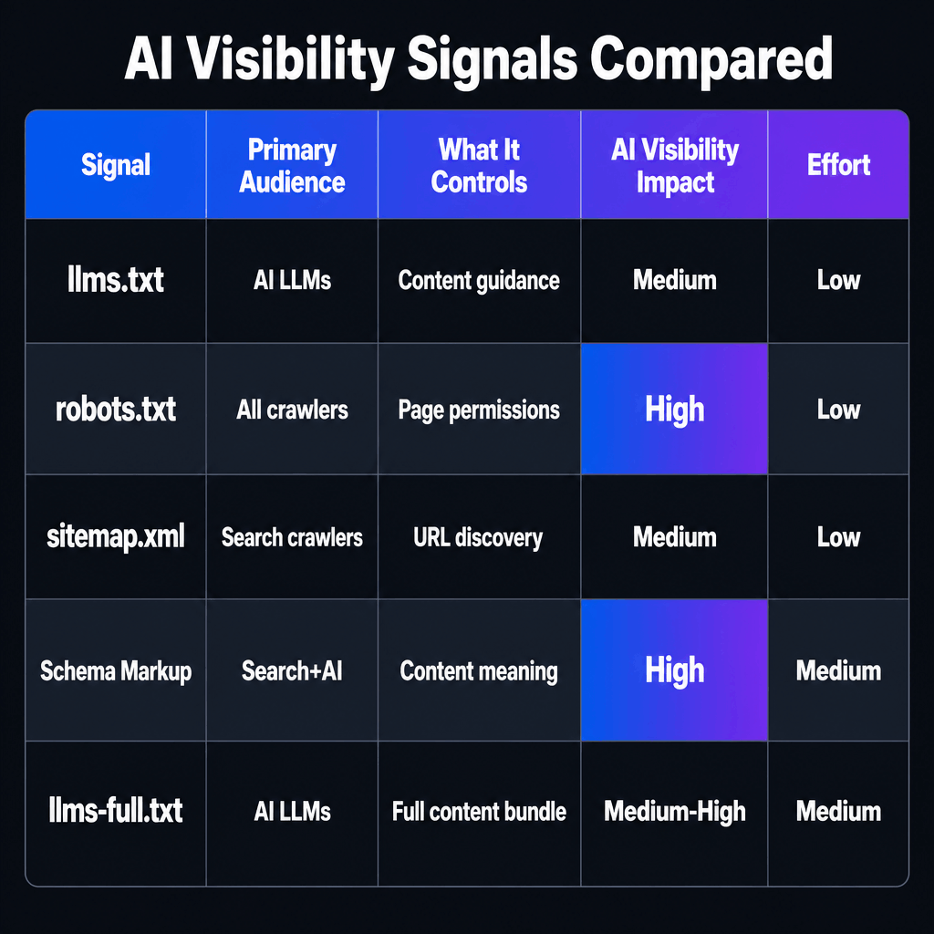 SignalPrimary AudienceWhat It ControlsAI Visibility ImpactImplementation Effortllms.txtAI language modelsWhich content AI should read; Markdown summariesMedium. Guides AI reading, unproven citation boostLow (1–2 hrs)robots.txtAll crawlers (Googlebot, GPTBot, etc.)Which pages crawlers can/cannot accessHigh. Blocking GPTBot nullifies all other AI signalsLow (already exists)sitemap.xmlSearch engine crawlersWhich URLs exist and when they were updatedMedium. Helps AI crawlers discover pagesLow (auto-generated by most CMS)Schema MarkupSearch engines + AI enginesStructured meaning of content (FAQs, articles, org data)High. Directly improves AI answer extraction and citationMedium (requires dev or plugin)llms-full.txtAI language modelsFull Markdown content bundle for deep AI readingMedium-High. Reduces processing friction for long-form contentMedium (requires Markdown versions of pages)