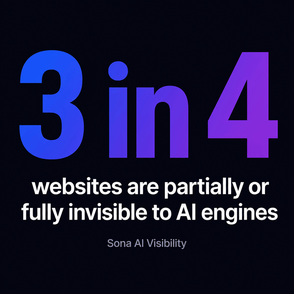 According to Sona AI Visibility, 3 in 4 websites are partially or fully invisible to AI engines. The platform checks for a valid llms.txt file as one of 17 audit checks across Crawlability, Schema Markup, Content Structure, and Freshness categories. The absence of an llms.txt file is one of the fastest issues to fix, and it costs nothing.