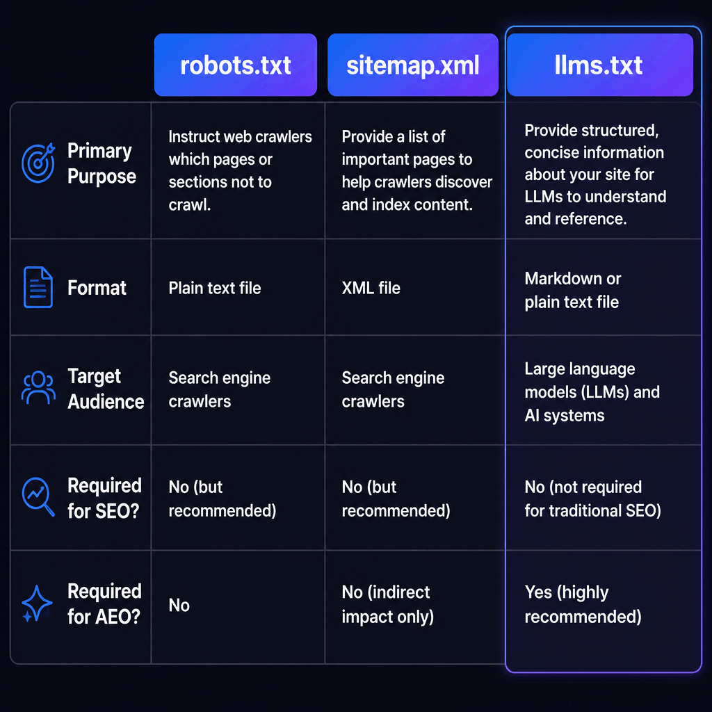 Featurerobots.txtsitemap.xmlllms.txtPrimary purposeControl crawler accessList URLs for indexingGuide AI content comprehensionFormatPlain text directivesXMLMarkdownTarget audienceAll crawlersSearch engine indexersAI language modelsContent includedAllow/disallow rulesURLs + metadataTitles, descriptions, contextPlacementRoot (`/robots.txt`)Root or subdirectoryRoot (`/llms.txt`)Required for SEO?YesRecommendedNo (but emerging)Required for AEO?PartialPartialRecommendedSupported by Google?YesYesExperimentalSupported by ChatGPT?Partial (GPTBot)NoEmerging