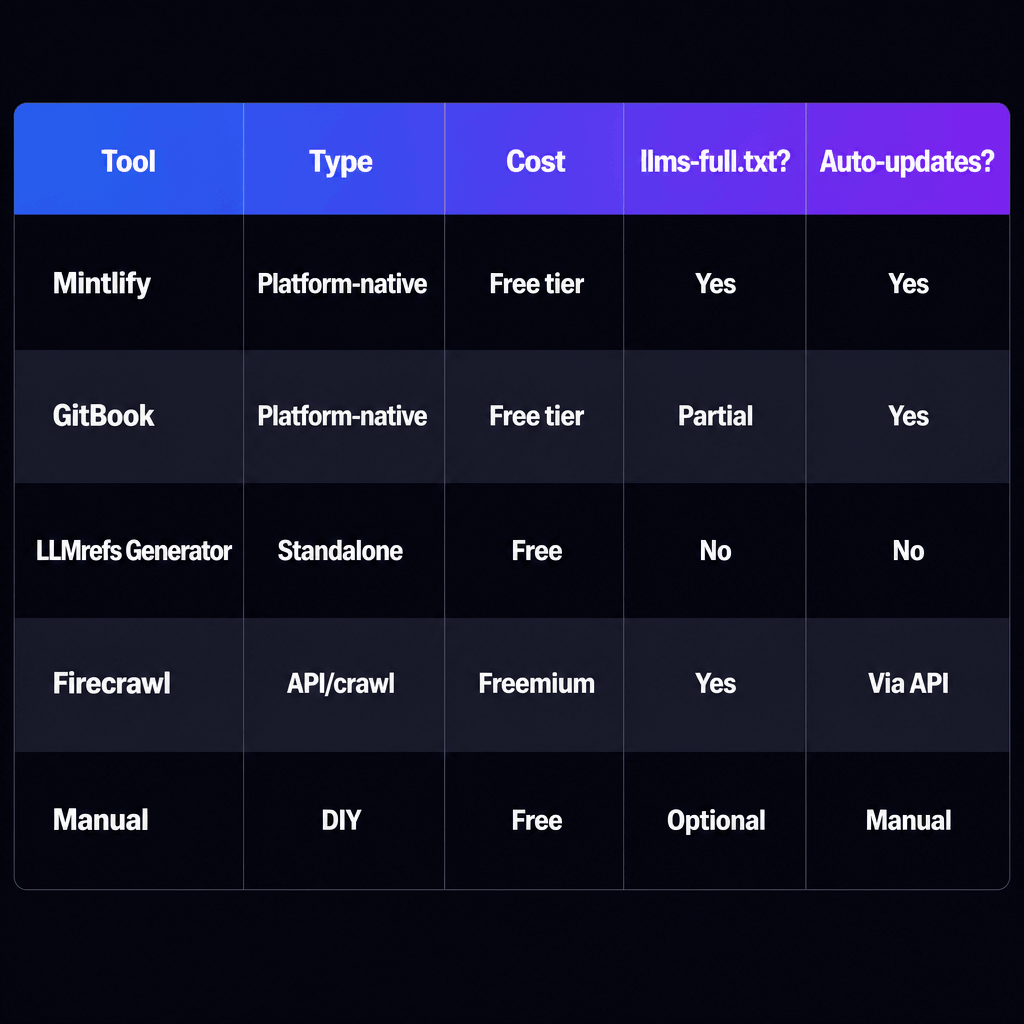 ToolTypeBest ForCostllms-full.txt?Auto-updates?MintlifyPlatform-nativeDeveloper docsFree tier availableYesYesGitBookPlatform-nativeProduct/SaaS docsFree tier availablePartialYesLLMrefs GeneratorStandalone toolAny websiteFreeNoNoFirecrawlAPI/crawl-basedLarge sites, custom buildsFreemiumYesVia APIManual (text editor)DIYSmall sites, full controlFreeOptionalManual