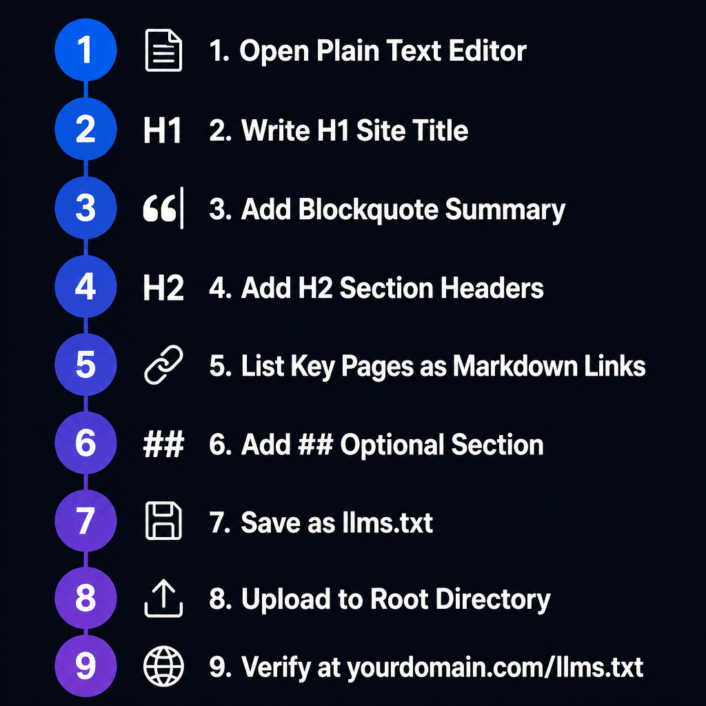 Creating an llms.txt file requires no special tools. Open any text editor, follow the Markdown structure from the official spec, list your most important pages with descriptions, save the file as `llms.txt`, and upload it to your website's root directory.