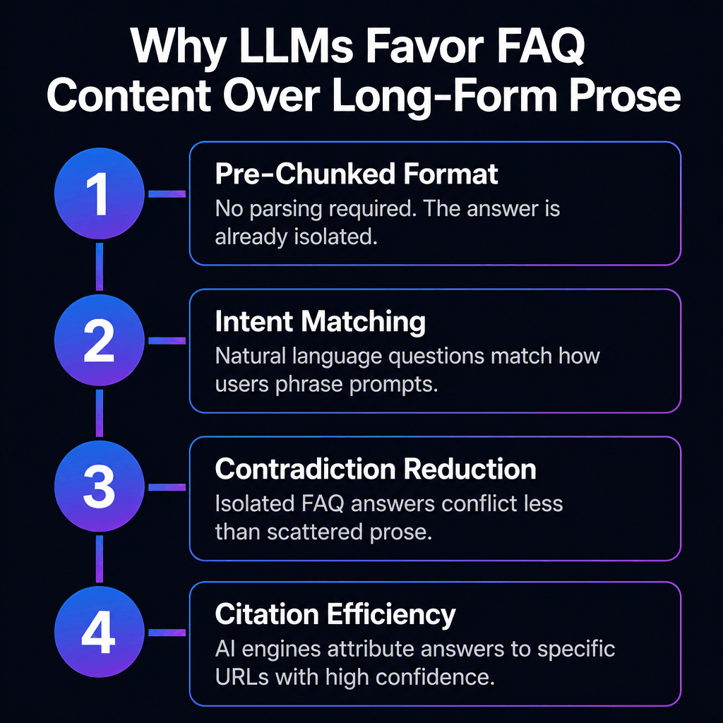 Four structural reasons LLMs favor FAQ content over long-form prose: