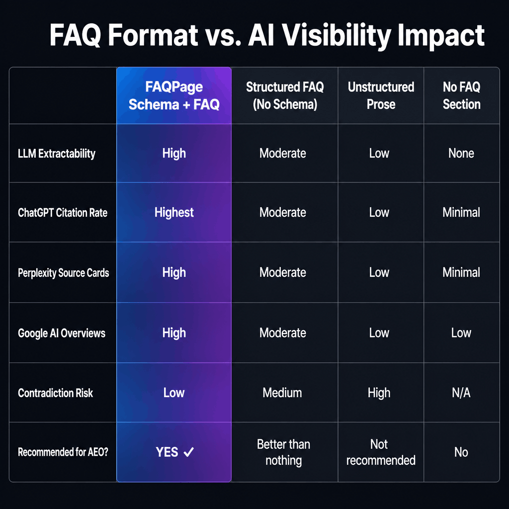 FactorFAQPage Schema + Structured FAQStructured FAQ (No Schema)Unstructured ProseNo FAQ SectionLLM extractabilityHigh — explicit Q&A signalsModerate — readable but inferredLow — requires summarizationNoneChatGPT citation rateHighestModerateLowMinimalPerplexity source card inclusionHighModerateLowMinimalGoogle AI Overviews eligibilityHighModerateLowLowImplementation effortMedium (JSON-LD required)LowNoneNoneFreshness signal compatibility`dateModified` in schemaVisible date onlyVisible date onlyNot applicableContradiction riskLow (canonical, structured)MediumHighNot applicableRecommended for AEO?Yes — highest ROIBetter than nothingNot recommendedNo