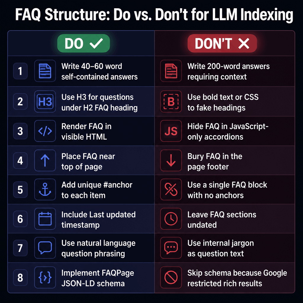 DoDon'tWrite 40 to 60 word self-contained answersWrite 200-word answers that require contextUse H3 for questions under H2 FAQ headingUse bold text or custom CSS to fake headingsRender FAQ in visible HTMLHide FAQ in JavaScript-only accordionsPlace FAQ near top of pageBury FAQ in the page footerAdd unique `#anchor` to each itemUse a single FAQ block with no anchor linksInclude "Last updated" timestampLeave FAQ sections undatedUse natural language question phrasingUse internal jargon as question textImplement FAQPage JSON-LD schemaSkip schema because Google restricted rich results