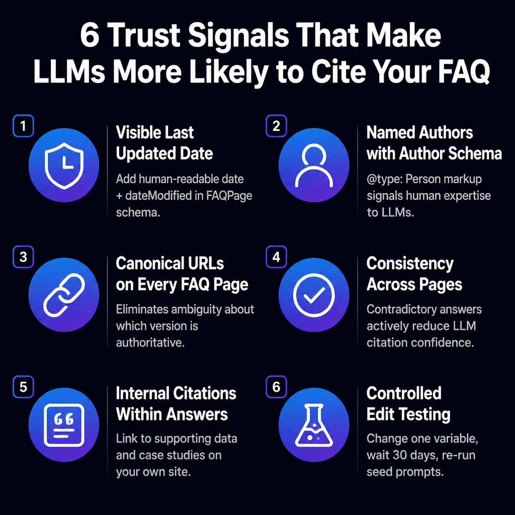 LLMs weight trust signals including publication dates, named authors, consistent canonical answers, and source citations within FAQ content when selecting which passages to surface. These signals matter as much as the answer itself.