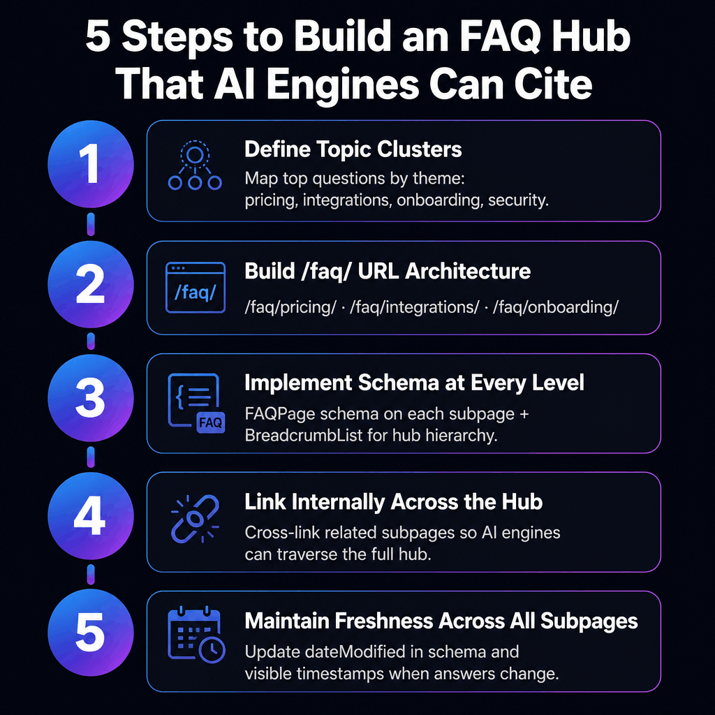 Five steps to build an FAQ hub that AI engines can navigate and cite: