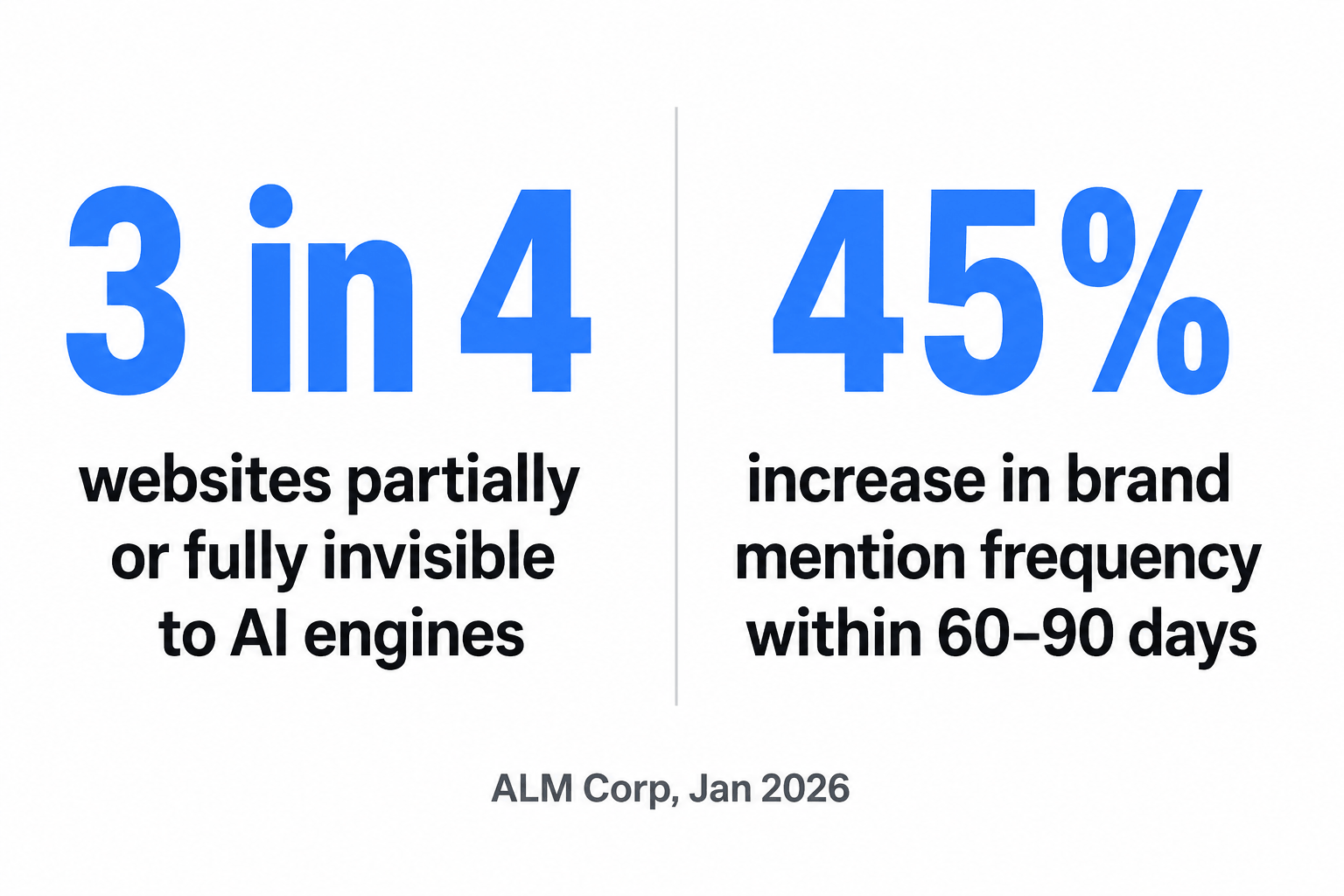 LLM optimization for AI visibility means structuring your content, schema, and technical signals so that AI engines can discover, parse, and cite your brand in generated responses. The most effective techniques combine semantic content depth, structured data (FAQPage, HowTo, Organization schema), content freshness, and multi-platform syndication, not traditional keyword targeting. ALM Corp's January 2026 research found that B2B SaaS teams implementing these strategies systematically report a 45% increase in brand mention frequency across major LLMs within 60 to 90 days. That figure comes from one study and should be treated as directional, not a guaranteed benchmark.