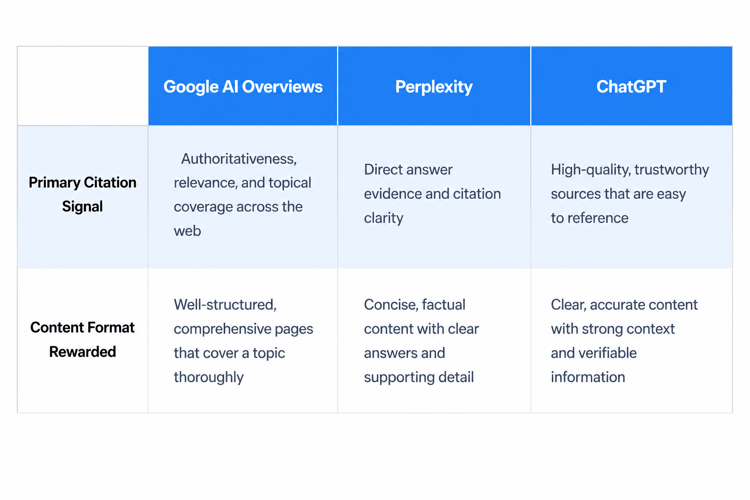 PlatformPrimary Citation SignalContent Format RewardedGoogle AI OverviewsJSON-LD schema, structured dataFAQ pages, HowTo guides, schema-rich articlesPerplexityDomain authority, long-form depthComprehensive guides, research-backed articlesChatGPTEntity density, source attributionDefinition-led content, named authors, cited claims