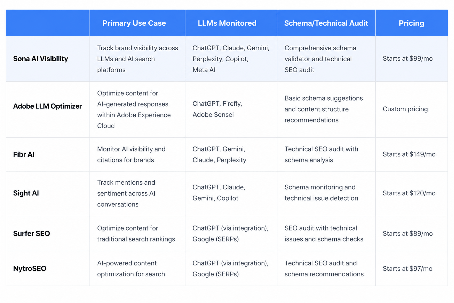 ToolPrimary Use CaseLLMs MonitoredSchema / Technical AuditPricingBest ForSona AI VisibilitySite audit: crawlability, schema, freshness, content structureGPTBot (live probe)17 checks incl. llms.txt, robots.txt, schemaFree (5 audits/day)B2B SaaS teams starting AI visibilityAdobe LLM OptimizerLLM app tracing, evaluation, best practicesEnterprise LLM appsStructured content guidanceEnterprise (paid)Large enterprise LLM deploymentsFibr AIMulti-LLM brand presence trackingGPT, Gemini, Perplexity, Claude, Grok (5)Presence analytics onlyPaidAgencies, growth teams tracking share of voiceSight AIReal-time brand mention and sentiment monitoring15+ major AI modelsMonitoring onlyPaidBrand teams tracking AI sentimentSurfer SEOContent optimization for semantic relevanceIndirect (content signals)SEO-focusedPaidContent teams optimizing for AI and SEONytroSEOAutomated JSON-LD schema and meta optimizationIndirect (schema signals)Schema automationPaidTechnical SEO teams scaling schema