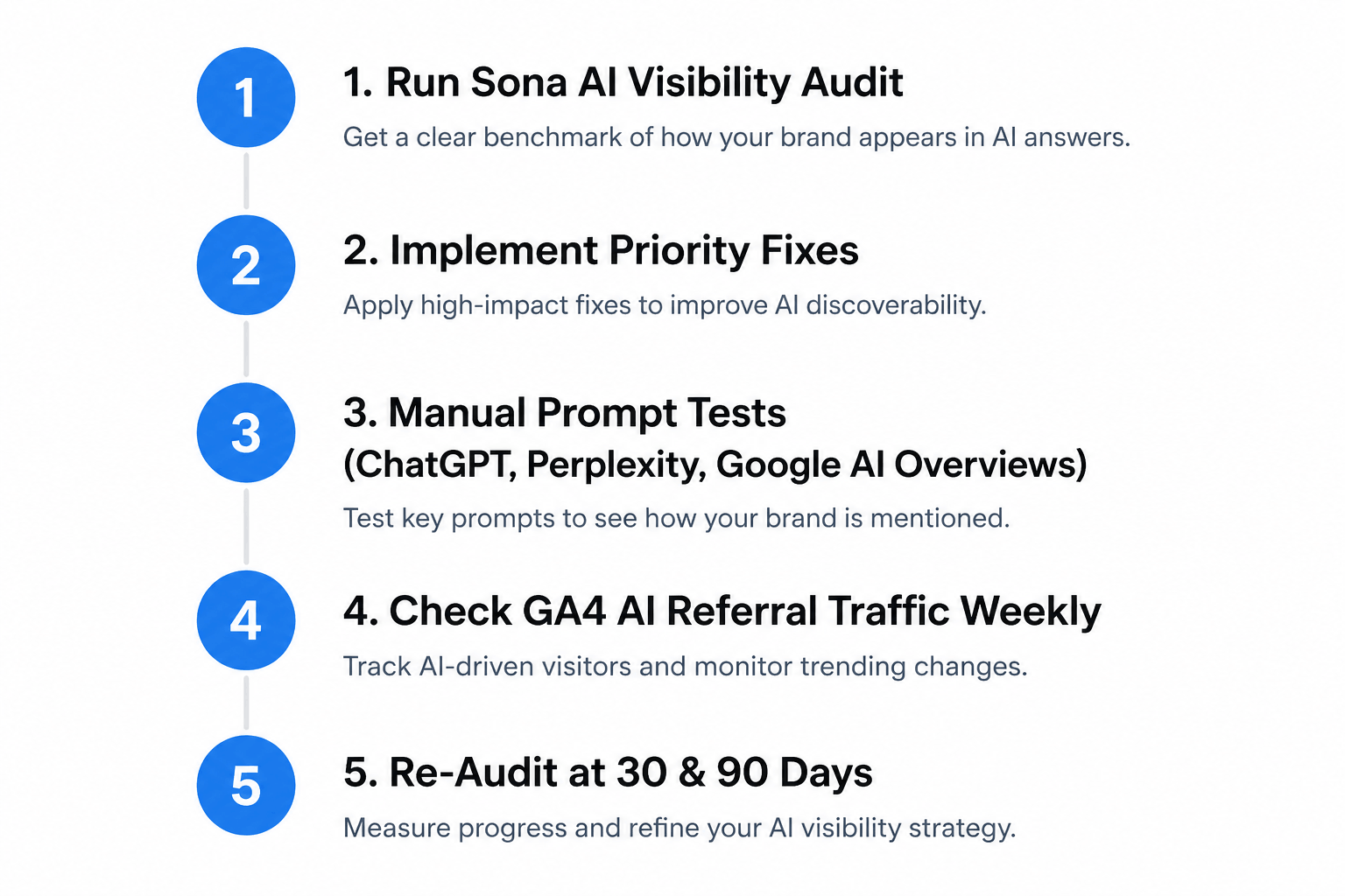 - Re-audit with Sona AI Visibility at 30 days and 90 days to track score improvements